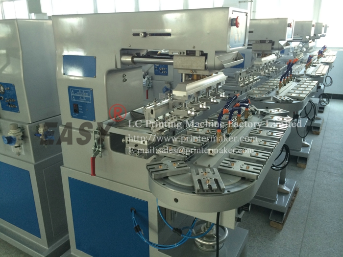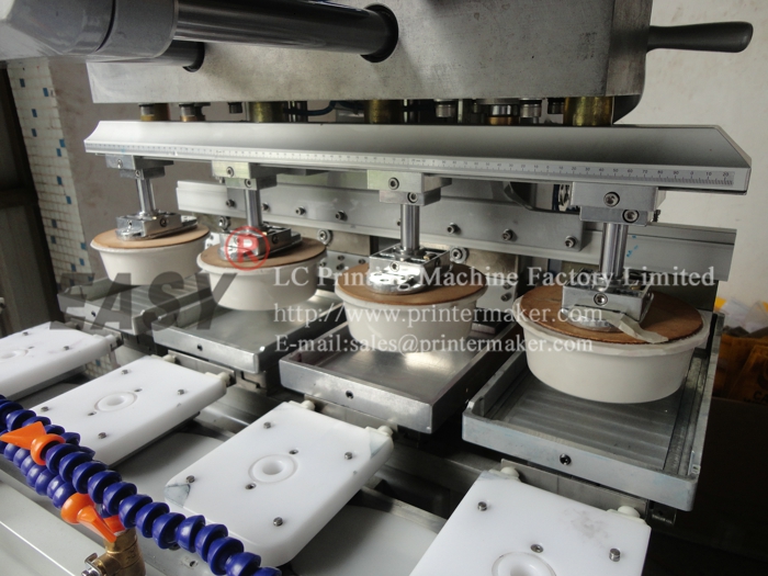 Four-colour open inkwell pad printer with conveyer: