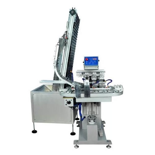 Máquina de tampografía automática para tapas de botella plástica con transportador. Se caracteriza por adaptarse a todo tipo de tapas y cubiertas, con alta capacidad de trabajo y excelente calidad de impresión. Cuenta con sistema completo de producción: alimentación automática, tratamiento de llama, impresión de 1 a 4 colores, secado por soplador de aire y descarga automática.