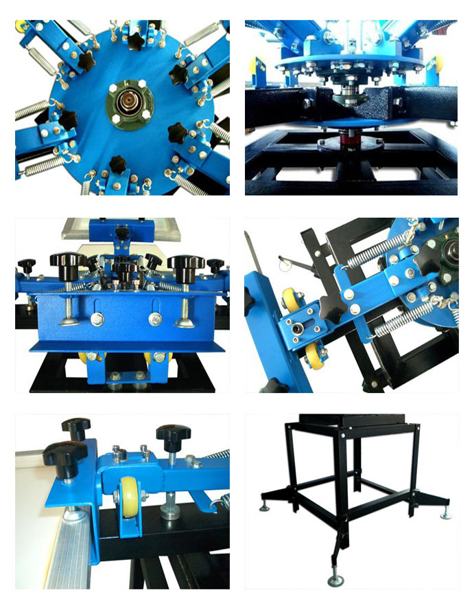 8 Color 8 Station Screen Press is the only the one and only double-rotary printing machine which adopts assembled instruction but still can guarantee the accuracy color registers of six colors in six station. It has kept the common functions of the similar machines, such as double rotary of pallet layer and screen layer, high pulling intensity of double springs, height of pallet putting up and down, screen adjusted in all round, left and right location of screen frame support arm, etc. What's more, it has some special functions with human nature, overcoming the shortcomings of the traditional machines, which brings more relaxed, accurate but higher efficient printing effect. So it's the highest cost-performance screen printing machine during the screen presses with the same prices.