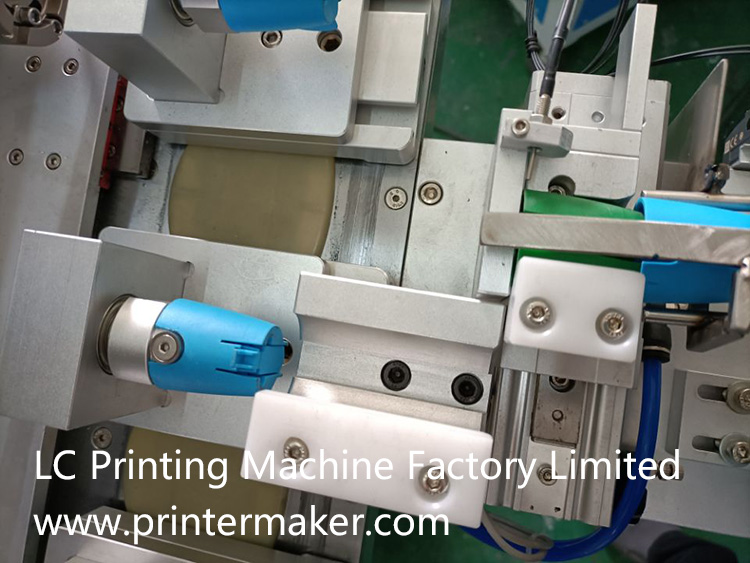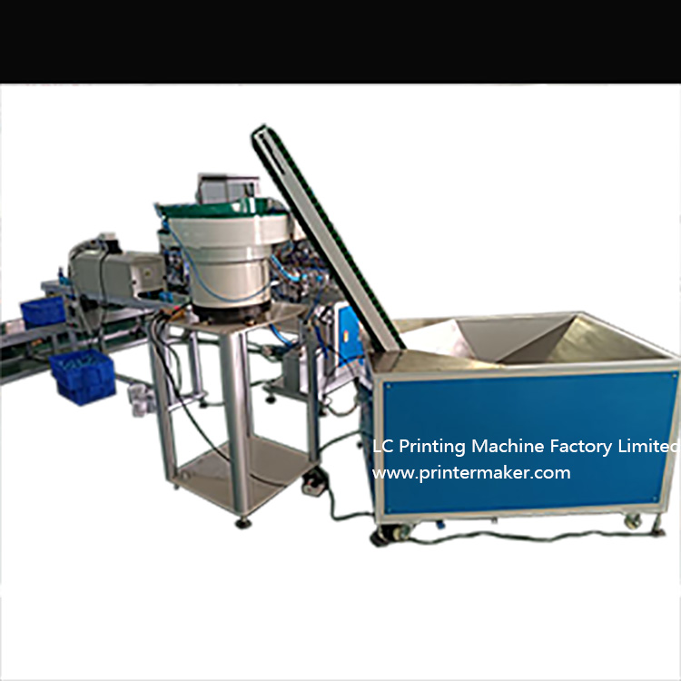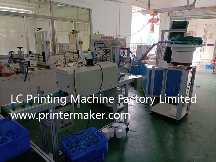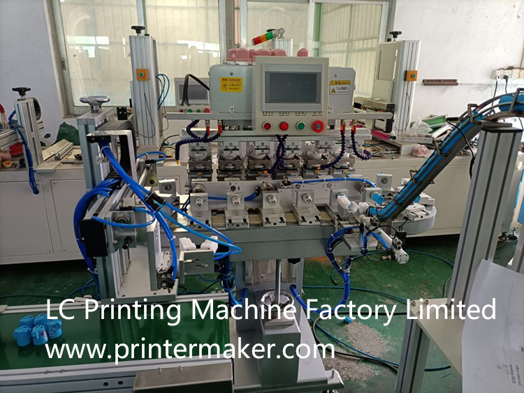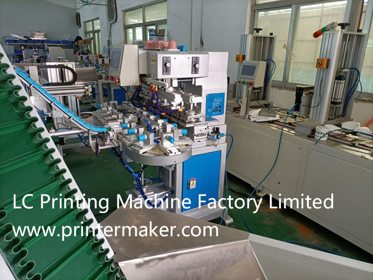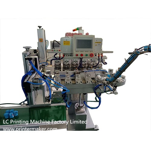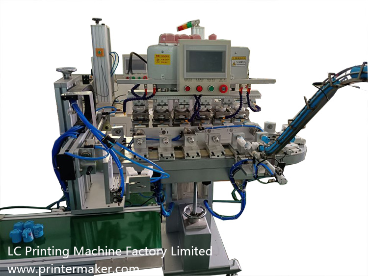Automatic Seal cup 6-Color Pad Printer with Conveyor model M6-BC included vibrating bowl, automatic application and automatic 16 stations deposition of painted elements and IR heating tunnel, Movable offloading conveyor belt based on set quantity)