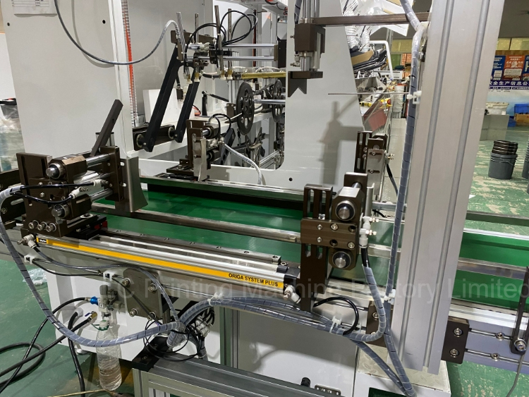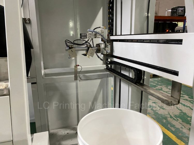 7: Silk screen frame and gear by servo motor for multi colors printing; If bucket is with ear handle needs flamer and UV by servo motor control; For single color it is no need servo control system.