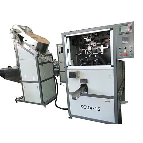 High Speed Automatic Screen Printing Machine for aluminum cap’s top and sidewall’s UV printing.