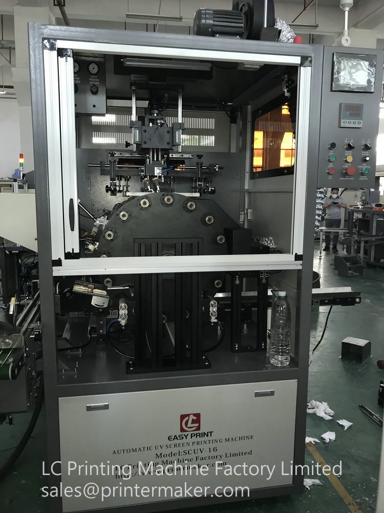 This machine is designed for both caps and bottles silk screen printing machine, it is attached automatic feeding system, flame treatment, screen printing, UV curing and offloading system.