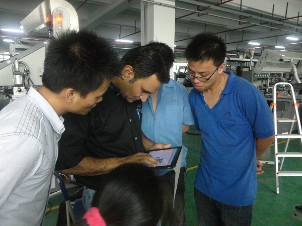 Dated on 6th, Sep, 2012, Machine Engineer Mr. Khan came to LC printing machine factory limited for the training after 8 days placing his order on the automatic screen printer on the wine caps. Mr. Khan is natived from Pakistan and had immigrated and has been working in Canada for 10 years. I am deeply impressed by his energetic, generous, righteous Characteristic. For the reason of first time visiting China, he showed a great interested in everything about China such as policy, people’s life standard, wholesale market etc. For the 3 days training on the machine, Mr.Khan showed a great satisfaction on his machine including the machine’s construction, adjusting flexibility, working capacity and stability etc. The training mainly including presenting how to set up and change to mandrels, how to adjust the screen printing station, how to setting the encoder, explain the function PLC control panel, amending and adding the PLC expression in different language, how to make the silk screen frame, how to tighten the silk frame etc.