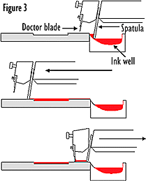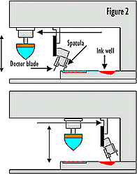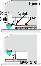 I have to admit a prejudice: this is my favourite press style if it is well engineered. Ink is contained in an ink trough located behind the cliche, as shown in Figure 3. The ink is pulled forward out of the trough by a spatula that is mounted on a horizontal carriage together with the doctorblade assembly. (Think of the squeegee/floodbar assembly on a screen printing press.) While ink is being flooded across the cliche, the horizontal carriage covers it and reduces the solvent evaporation. When retracted, the mechanism covers the ink trough. Let me make it clear that this does not seal in the ink as with a closed-cup press, but if does inhibit the evaporation of solvents. The ink/solvent mix will remain stable longer than in a completely open trough.
