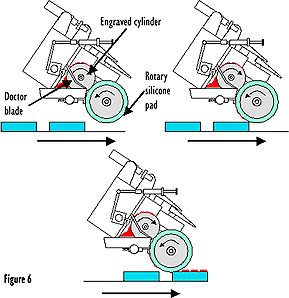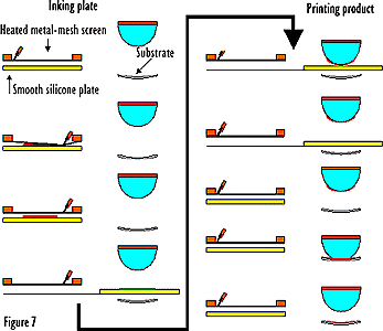 This technique, developed for printing onto ceramic items, uses a mix of pad-printing and screen-printing technology, as illustrated in Figure 7. These systems don't use etched cliches to carry the image. Instead, the ink or ceramic colour is screen printed onto a flat, silicone-coated plate. The ink rests on top of this plate rather than adhering, and is then picked up by the pad and transferred onto the substrate.