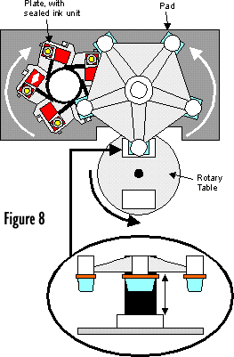 Above the cliches is a system of sealed ink cups that ink the plate by passing over the image area and returning to the rest position. cliches are inked just prior to pad wetting. After the pad picks up the image, the pad carousel and the cliche-carrying table then rotates so that the pad carrying the image is over the substrate while another pad is positioned over the freshly inked second plate. The imaged pad then descends and prints the part. Simultaneously, the second pad descends and picks up the image from the second plate. This sequence continues until the multicolour image has been printed, then the rotary table is indexed. The printed piece is removed and replaced with an unprinted part.