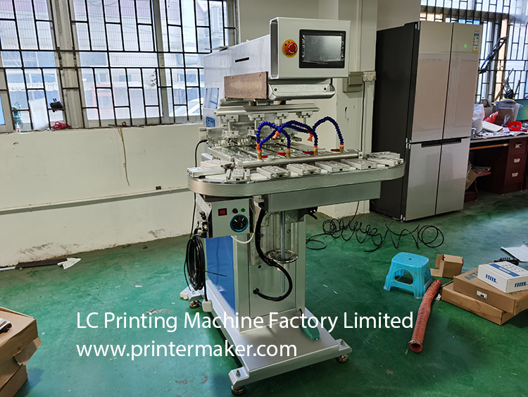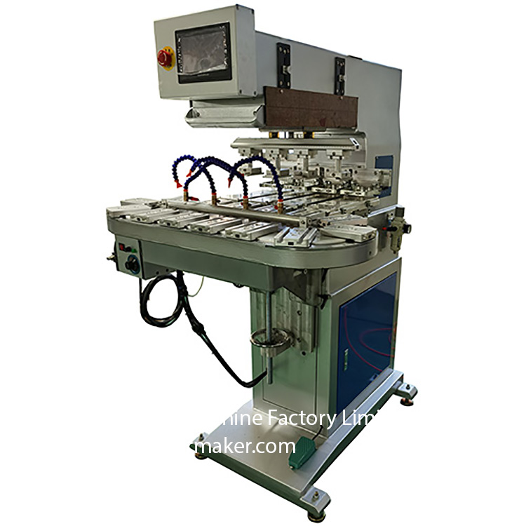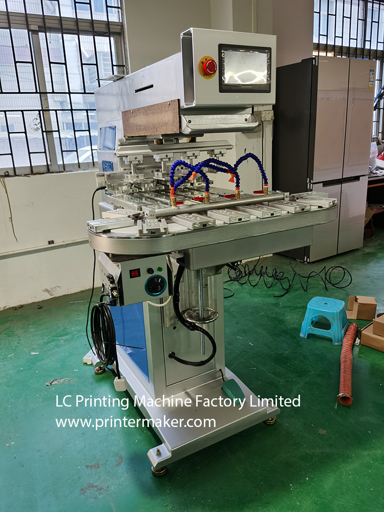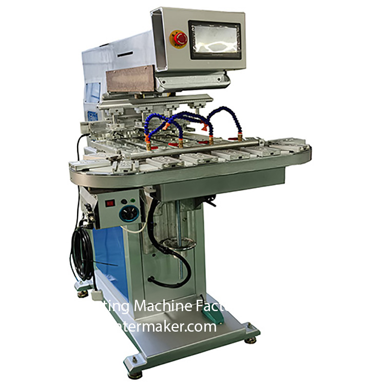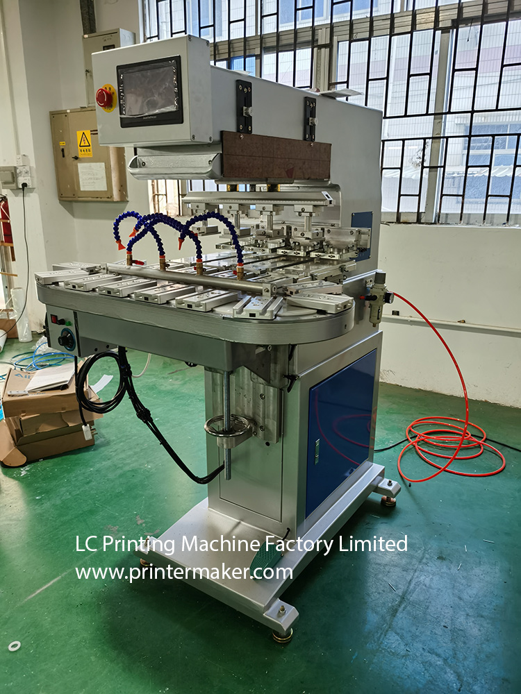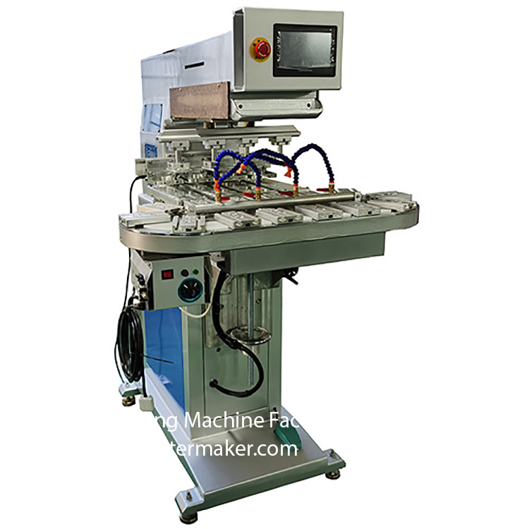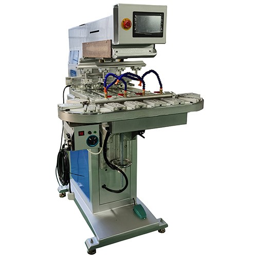 4 Color Pad Printer with Conveyor ensures that is environmental, safe, it is comply with CE Standard, ease operating, to consume ink that frugal. Help to reduce any solvents evaporating from the ink too quickly and also helps to keep the ink at a constant temperature.