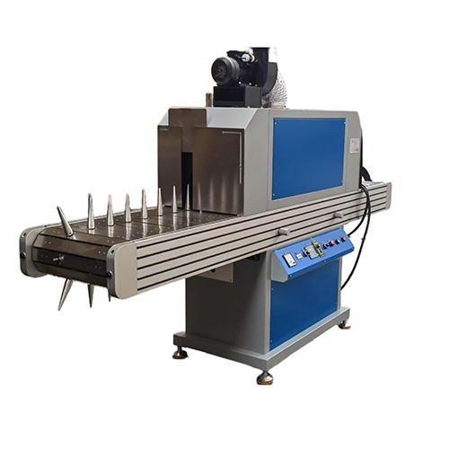 La máquina es adecuada para el secado y curado de frascos de plástico o vidrio redondos y ovalados. Se usa ampliamente en el curado final de impresión de frascos de cosméticos y productos domésticos. El soporte es extraíble, por lo que también es apta para el curado de productos planos.