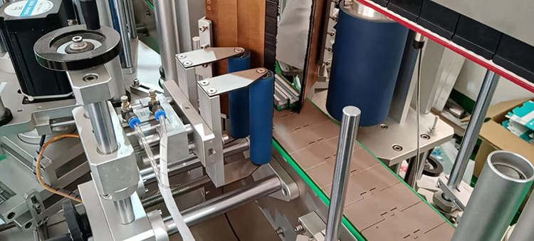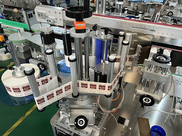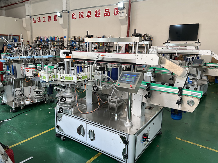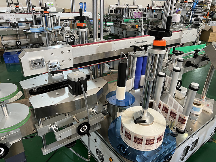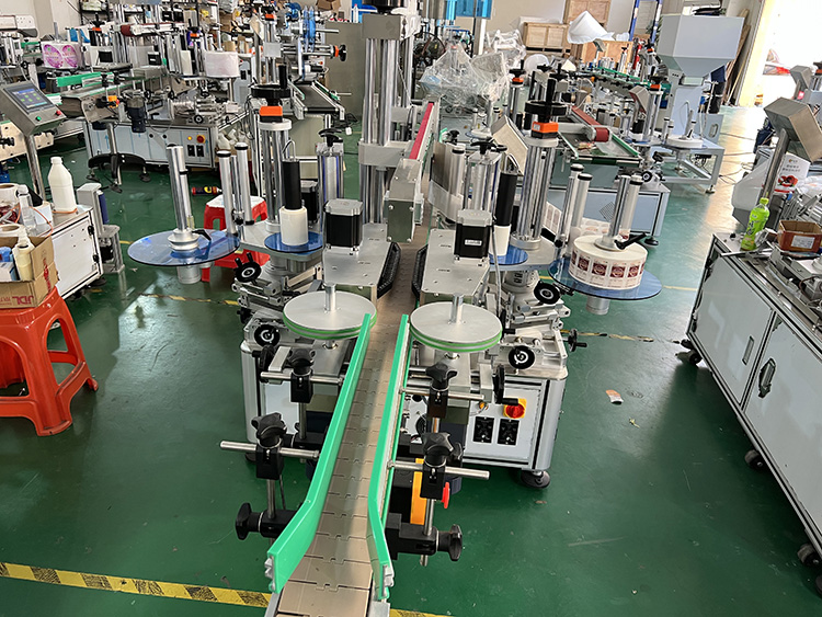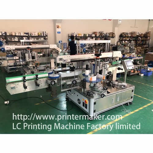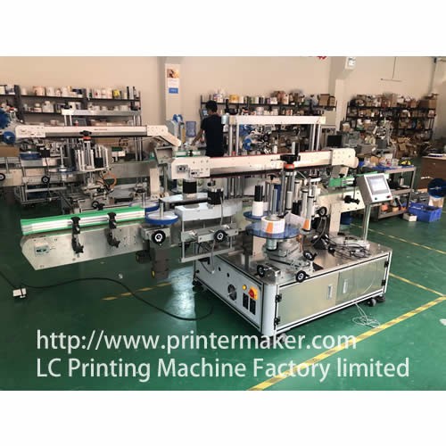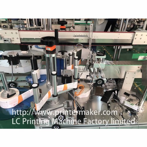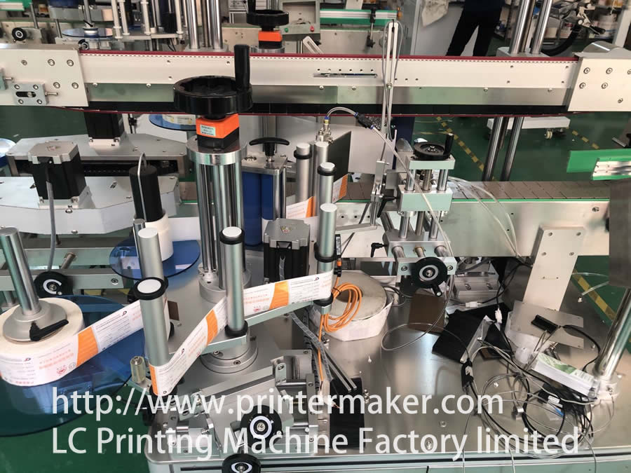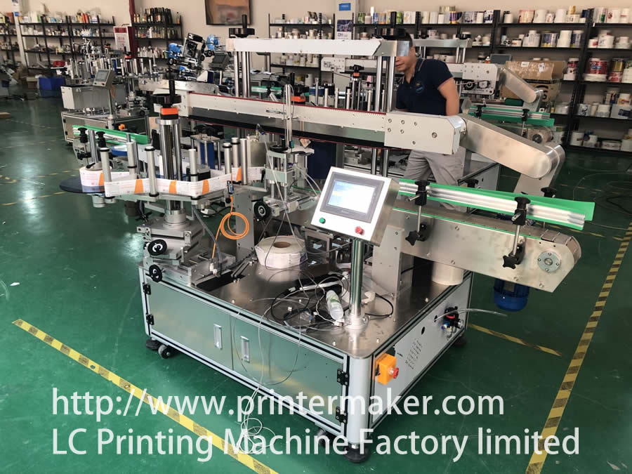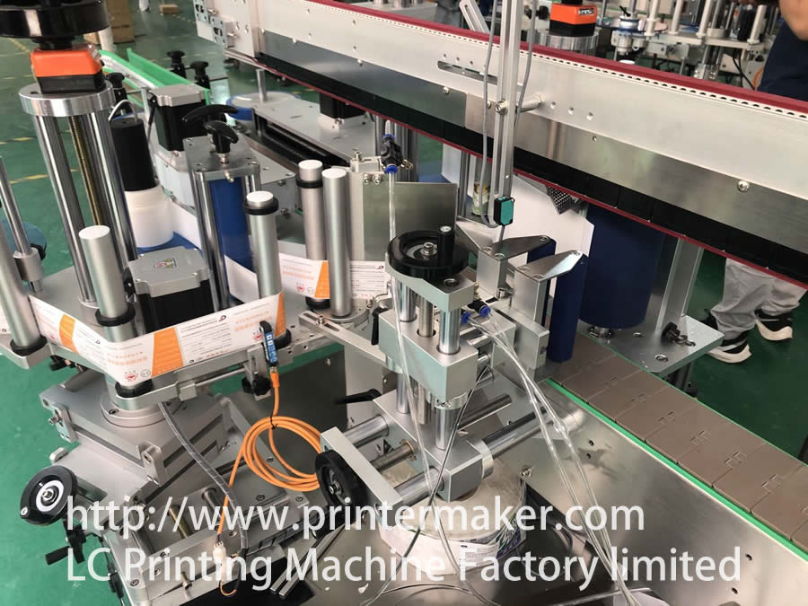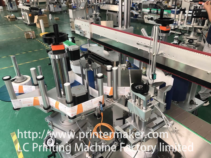 The machine can simultaneously achieve two-sided circumferential surface labeling and labeling features to satisfy the flat bottles, square bottles and bottle shaped single-sided and double side labeling, the entire circumference of the cylindrical body, a half weeks labeling, widely used cosmetics industry, daily chemical industry.
