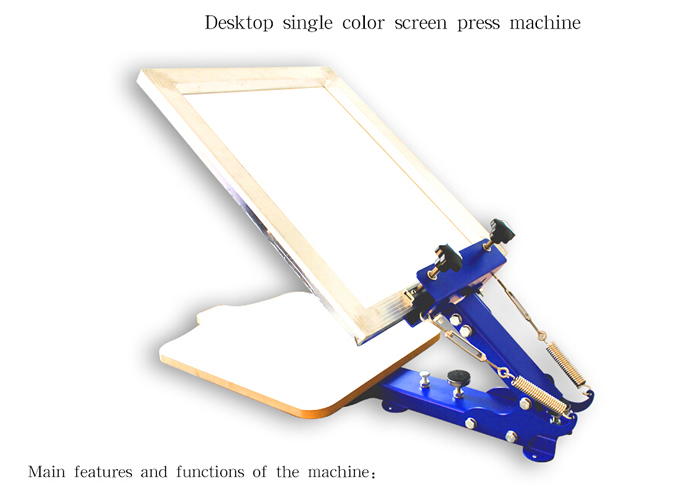 This is one color simple screen printing with very low cost and is especially suitable for single color T- shirt printing.it is fix on table –board,That machine cannot adjust up and down.