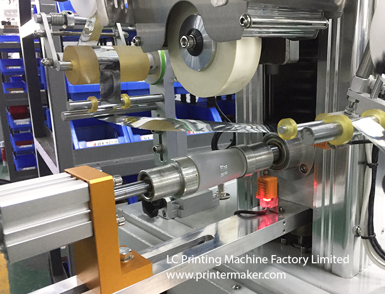 This gilding press machine is applicable to stamp and form the contour lines on the abnormal bottle (irregular shape plastic) caps such as oval, cone shape, round, square shape, featuring good mobility and uniform(round and oval, flat, tapered, multi-faced) and polished stamps with no joints on the outward curved surfaces or corners.