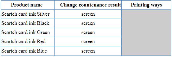 Our company produces of scrape card printing ink to haven't and deeply and only, cover up power like, blow etc. is to the convenience distinguishing feature, extensively applied in lottery ticket, lottery ticket, the telegraphic code defends false marking, keeping secret file, showing volume and child to scrape a painting soon etc. realm.