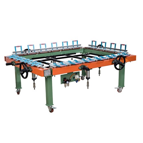 El primer paso es tensar la malla sobre bastidores de aluminio, madera o acero mediante la máquina de tensión. El control neumático sujeta el bastidor metálico garantizando un contacto compacto con la superficie de la malla. El ajuste por volante manual permite conseguir una tensión precisa. Se pueden tensar varios bastidores al mismo tiempo, asegurando la misma tensión de malla y una correcta superposición de impresión.
