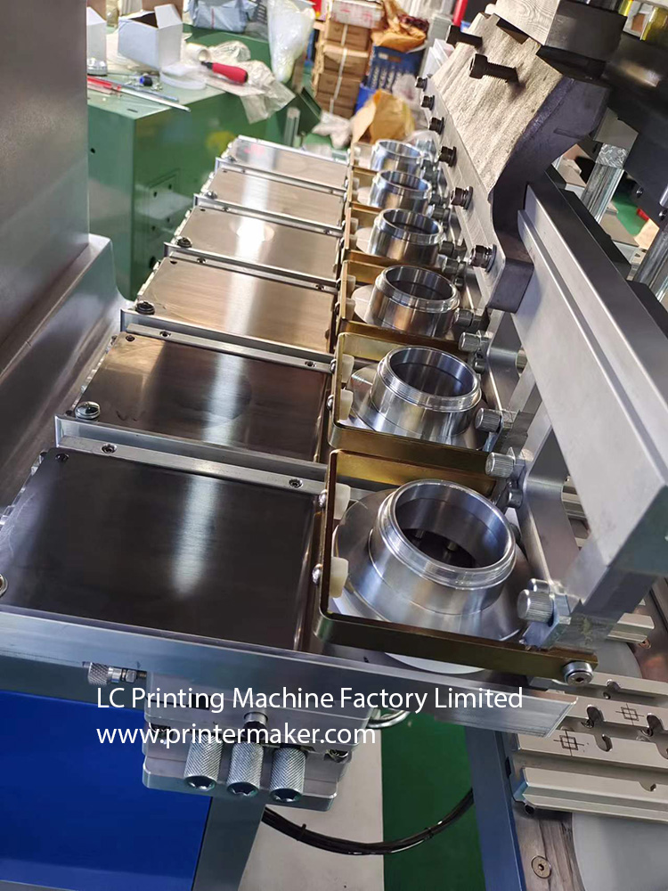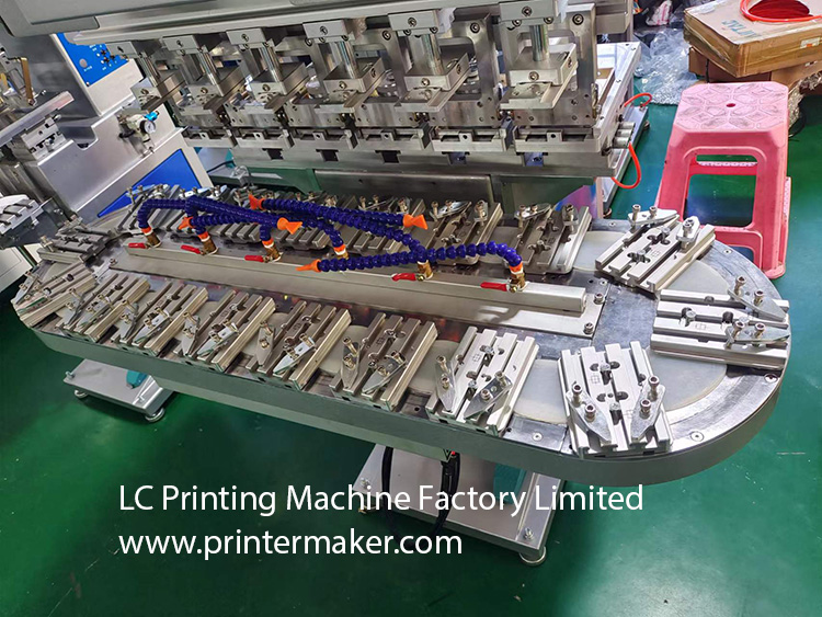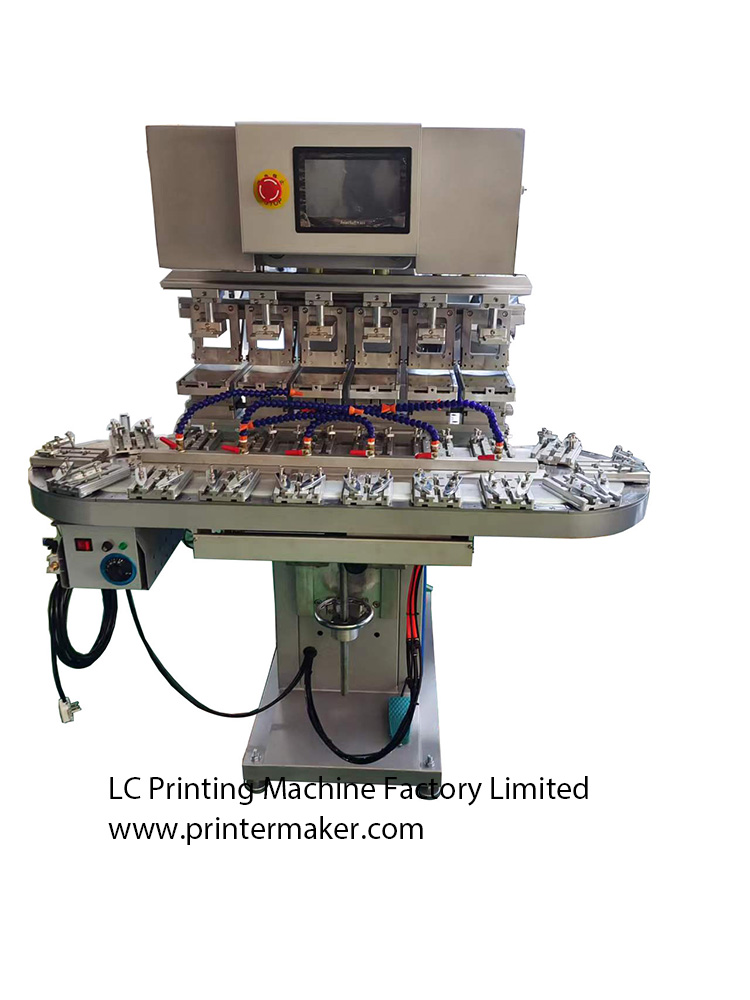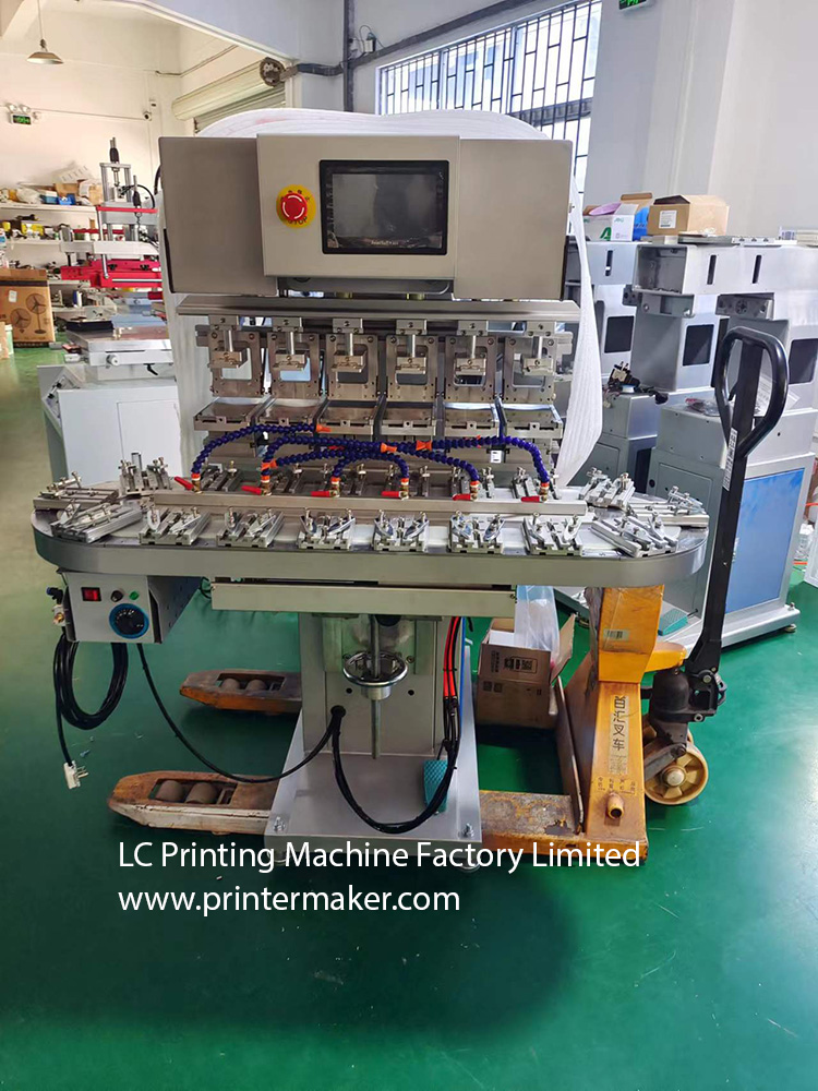 EP6C-150T Six Colors Pad Print Machine with Conveyor, conveying products by rotary type turntable. The products can be overprinted with 6 colors. Running a circle can finish one time overprint. Comparing with shuttle pad printer, it come to a high steps. It can print bigger products with 6 color with fast. It's suitable for printing logo on the surface of electronic products, plastic shell, hardware, stationery etc.
