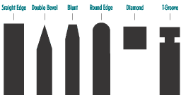 A screen printer can purchase a squeegee with many different profiles. The profile of the Squeegee determines the thickness of the ink deposit laid down, and the effectiveness of the Squeegee on different substrates. See chart for enclosed profiles. Available edge profiles include a square edge, a square edge with rounded corners, a round edge, a double-sided beveled edge, and a single beveled edge. Squeegees with a square edge are the most common, and mainly used on cylinder, textile, and manual presses. Rounded Squeegees are generally limited to the textile industry, and are used when a very heavy deposit is required. Beveled Blades are typically used for printing rounded surfaces where fine definition is required. While double sided beveled blades are more efficient on high-speed automatic machines. Single Beveled blades produce excellent results when printing heavy solids.