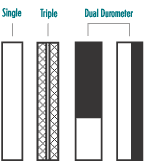 Dual durometer blades were the first real innovation in Squeegees. By casting a hard durometer on to a soft material, the printer ultimately benefited by having a Squeegee that had a soft print edge, and a rigid backing material supporting it. This had been done for years with stainless steel backing plates on many presses. There is a big disadvantage of a dual durometer blade. The blade can only be used in one direction, and after long periods of time, the blade will eventually develop a curl or set in one direction. Triple durometer Squeegees have taken the place of dual durometer Squeegees. The triple blade ( sandwich style) has the harder durometer in the middle of the Squeegee rather than one side, and a soft or medium hardness on the outside. This blade can be used in both directions.