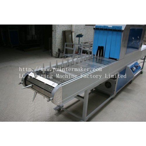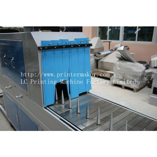 La máquina está diseñada para el secado y curado de frascos de plástico o vidrio redondos y ovalados. Se usa ampliamente en el curado final de impresión de frascos cosméticos y productos domésticos. El soporte es extraíble, por lo que también es válida para el curado de productos planos.