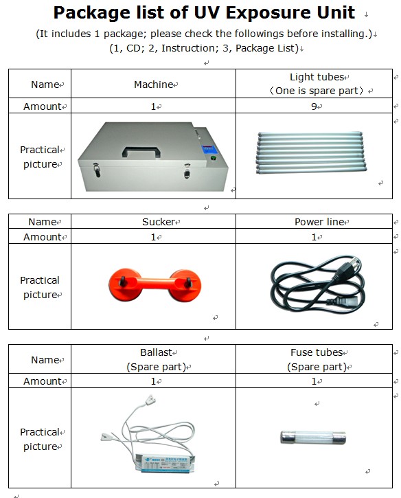 3.Place the film and screen plate, turn on the power, press the green key, the machine begins exposing. When finishing it, the light tubes turn off automatically and buzzer rings. If you want to go on, you can place the materials and press green key again. The buzzer stops ringing and the lights on. The machine works as before.