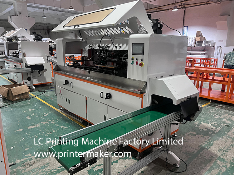 This single color automatic UV screen printer has been lengthening the printing center distance into 480mm which is fitting on max. 200mm diameter cone and cylindrical bottles in 360 angle degree silkscreen printing.