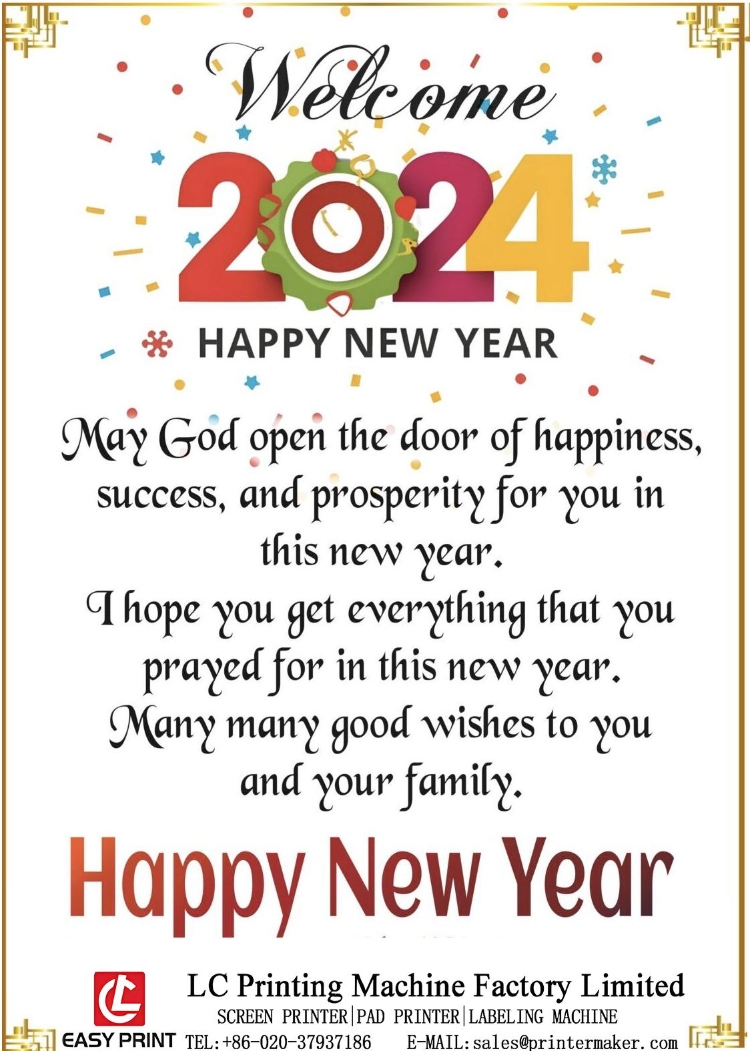 Happy New Year in 2024! To dear all customer: Wish you and your family a very happy, healthy, and prosperous New Year in 2024! On behalf of LC Printing Machine Factory Limited, I would like to express my great gratitude for your attention and kind support since years ago. All stuff from LC printing machine factory limited will further continual our best service and best support for you in matter of your repeat order, any new project solution, customizing machine as per your request etc.Looking forward to further extend the business cooperation with your esteem company in the year of 2024!
